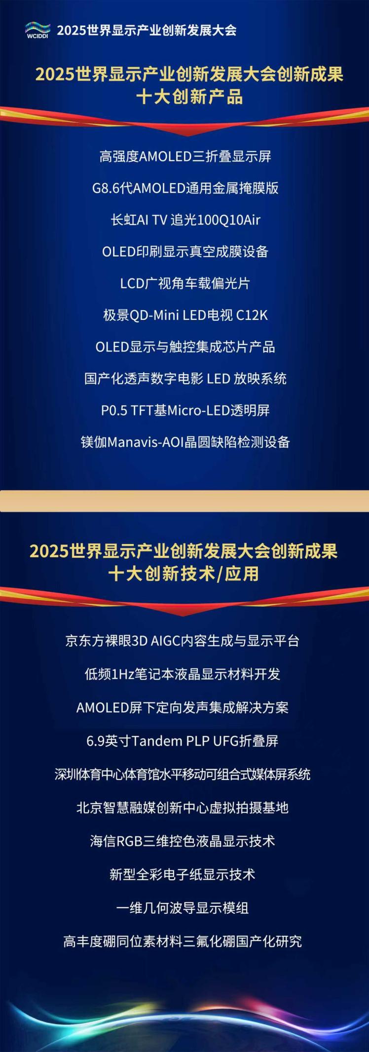 据悉,为树立行业标杆、共享创新成果、营造良好产业生态,经国际信息显示学会、中国电子视像行业协会、中国电子材料行业协会等国内外重点行业机构和单位推荐,大会综合技术领先性、市场竞争性、功能适用性、创新独特性,推选出十大创新产品、十大创新技术(应用)为“2025世界显示产业创新发展大会创新成果”。