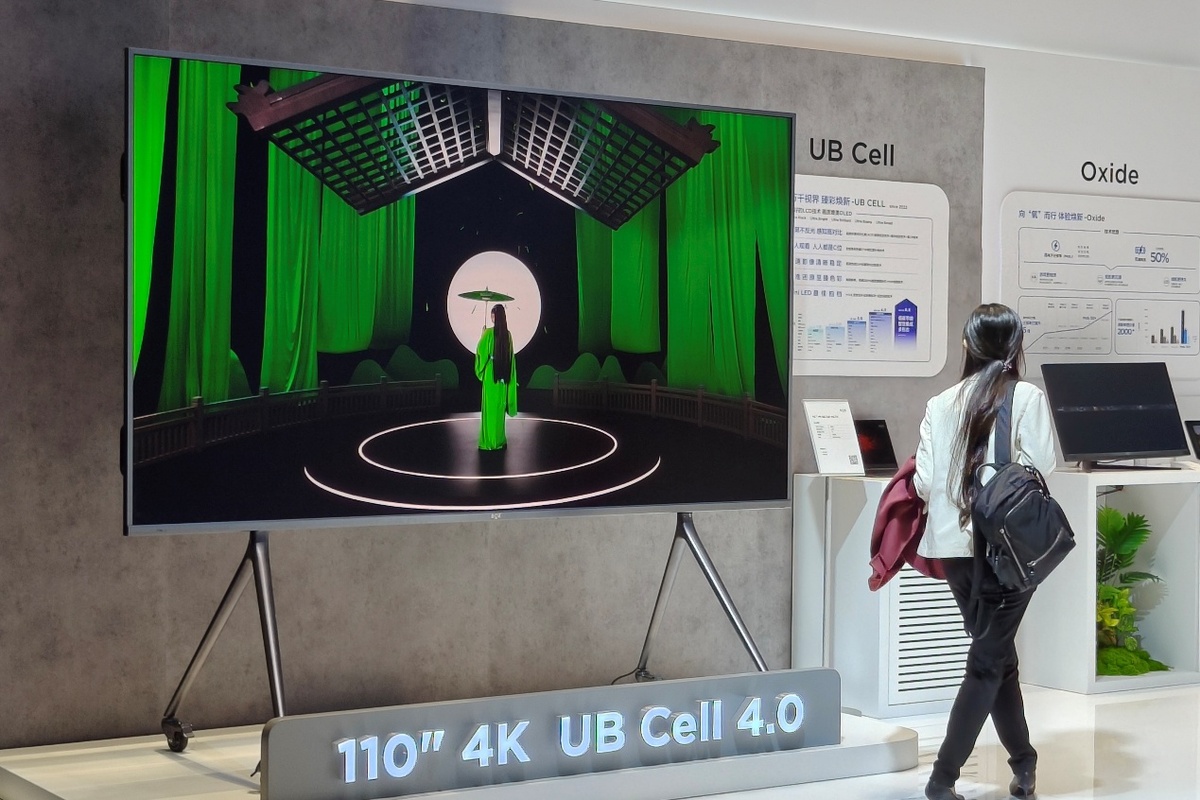 作为国内率先推出显示行业首个技术品牌的企业,此次展会京东方三大技术品牌的创新突破成为焦点。在ADS Pro(高端液晶显示)方面,京东方展出的110英寸4K UB Cell TV,经过多次技术迭代,最新的UB Cell技术已经实现行业领先的0.4%镜面反射率,家庭常规环境光照(100lux)条件下,其环境光对比度ACR超过1400:1;UB Cell利用SAP光谱孔径像素设计技术,搭配STW相位差补偿技术2.0,实现BT2020 95%超高色域表现,同时做到全视角无色偏、无眩光,其画质可媲美OLED。