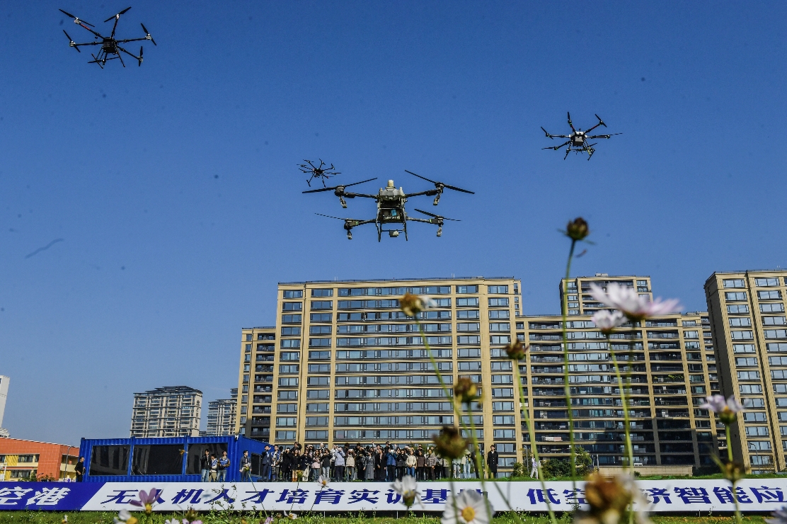 “无人机起飞时,要缓慢推动摇杆,密切关注无人机的姿态和飞行状态,确保其平稳上升。”在低空经济全链条研学基地,在老师的指导下,大学生从旁观到亲手操控,真实体验了无人机的操作系统与灵活机动性。伴随着阵阵“嗡嗡”声响,一架架无人机在老师的指导下,稳捷起升、精准降落。
